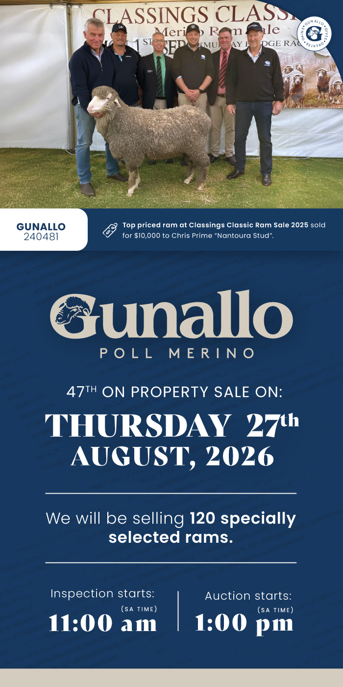 STUD CALENDAR ClassingsClassicRam Sale READ MORE SouthEastField Day READ MORE Karoonda & District Stud MerinoField Day READ MORE HamiltonRamSale READ MORE Gunallo OnPropertySale READ MORE AdelaideRamSale READ MORE Beendigo Australian Sheep & WoolShow READ MORE See All Ram Sales ACCREDITED OVINE BRUCELLOSIS FREE MN3STATUS SHEEP MAP HIGHLIGHTS Gunallo’s Most Successful Adelaide Ram Sale 2020 Read the Highlight Gunallo Tops Classing Classic 2020 Read the Highlight Gun 460 son makes stud’s $8800 on-property record Read the Highlight SEE all the highligths
